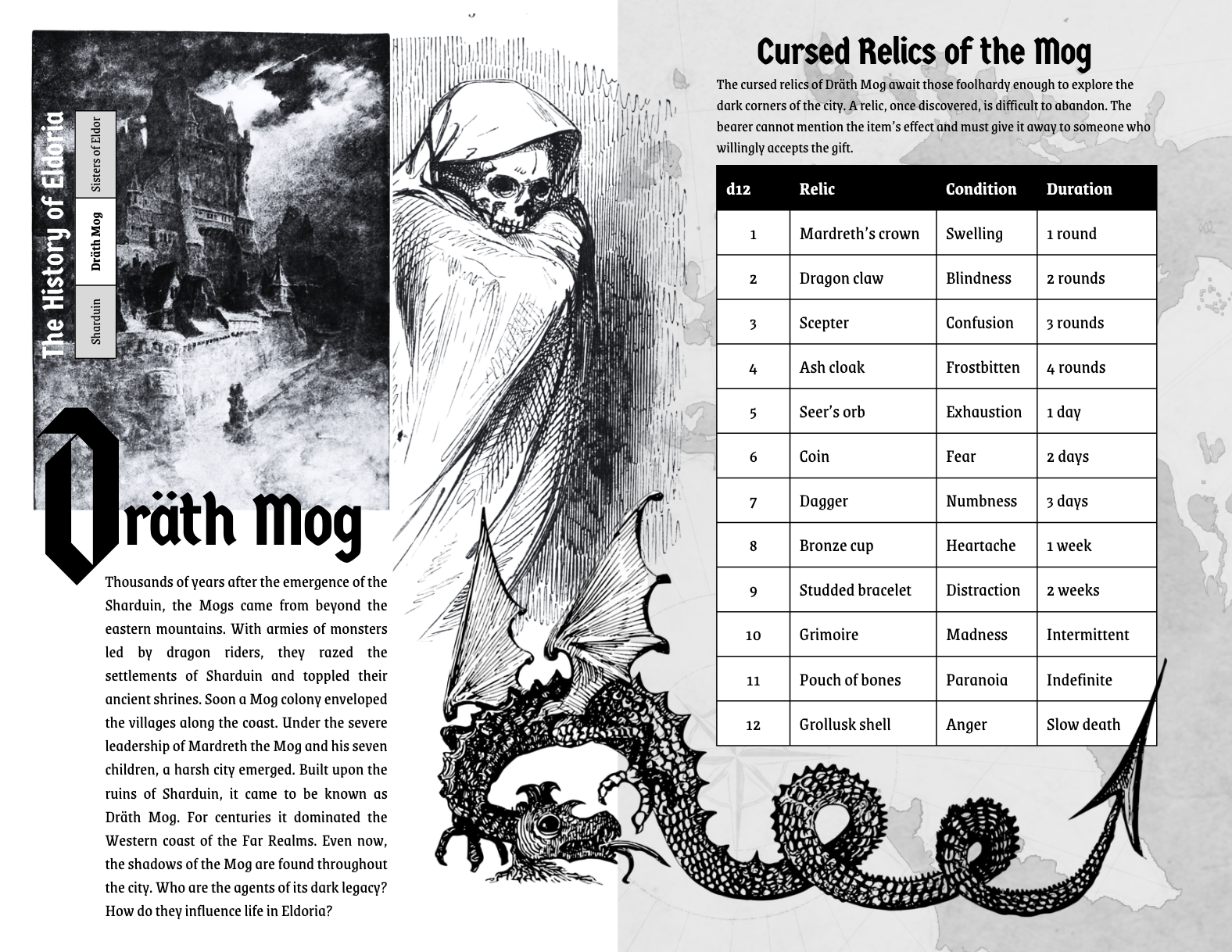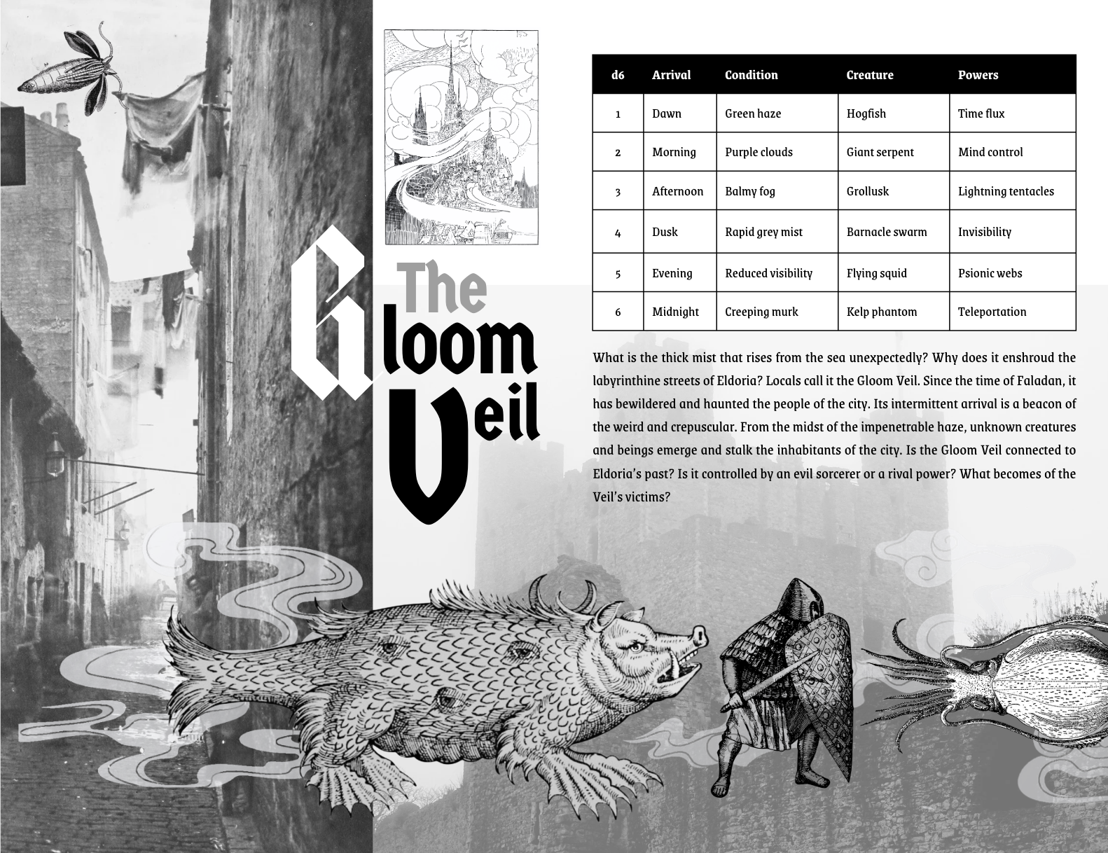 The Eldoriac, Vol. I invites you into an ancient metropolis alive with curious characters and hidden relics. Wander its winding streets and uncover the long-buried mysteries of the Sharduin. Seek out the secretive Gloam Fae silk weavers, or hunt for illicit arcana in the Misty Fell Market. Join a guild, place a wager, take on a risky job or spark a revolution. In Eldoria, unexpected adventure awaits!